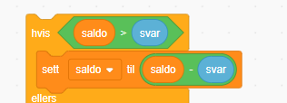 Program en skal spørre etter og ta i mot en saldo fra brukeren. Fra denne skal en trekke ønsket beløp, så lenge det er dekning på konto. En ferdig versjon av programmet finnes på https://scratch.mit.edu/projects/680452212