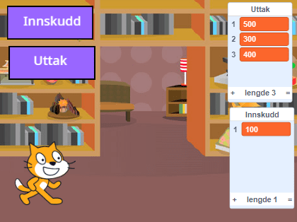 Program to skal også spørre etter en saldo, og ta i mot denne fra brukeren. Deretter velger brukeren enten å gjøre innskudd eller foreta uttak av penger fra kontoen. Innskudd og uttak legges inn i hver sin tabell, mens systemet regner ut ny saldo, som brukeren får presentert. En ferdig versjon av programmet finnes på https://scratch.mit.edu/projects/680793799