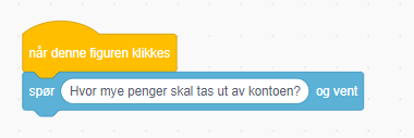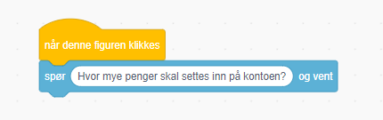 Programmet skal starte når det grønne flagget trykkes. Da skal programmet spørre etter hvor mye penger som er på kontoen din: