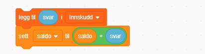 Vi legger svaret inn i listen for innskudd og regner deretter ut ny saldo.