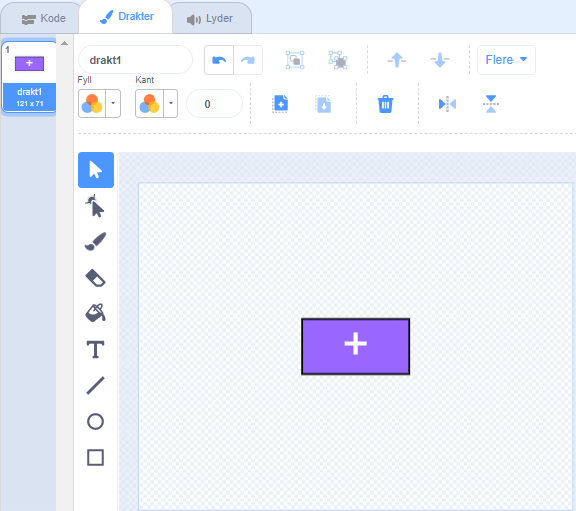 Vi lager en ny figur som skal fungere som knapp, eller finner en knapp i biblioteket. Når denne knappen trykkes på, starter den delen av programmet hvor elevene må finne oppgaver til svaret. Om du ønsker fine matematiske symboler, velger du å bruke tekst framfor å tegne dem.