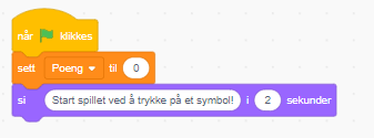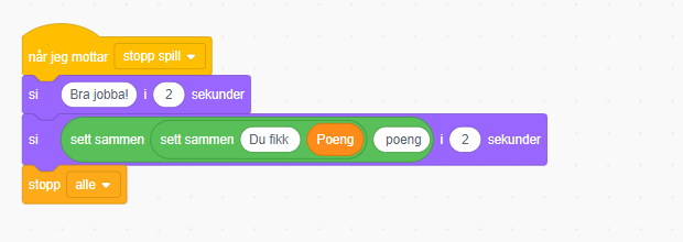 Når denne løkken er ferdig, er også spillet ferdig, og figuren vår kan gi melding til brukeren om hvor mange poeng brukeren fikk. Vi bruker meldingsblokkene for å fortelle figuren at spillet er ferdig og at det er på tide å telle opp poengene.