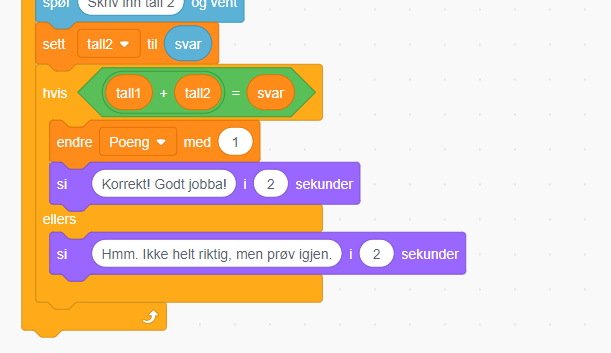 Når brukeren har gitt tallene som er oppgaven som passer til svaret, må vi selvsagt kontrollere dette. Vi legger inn en test på om svaret stemmer. Er det korrekt får brukeren meldingen om dette og brukeren skal få et poeng. Er det feil går en videre til et nytt tall.