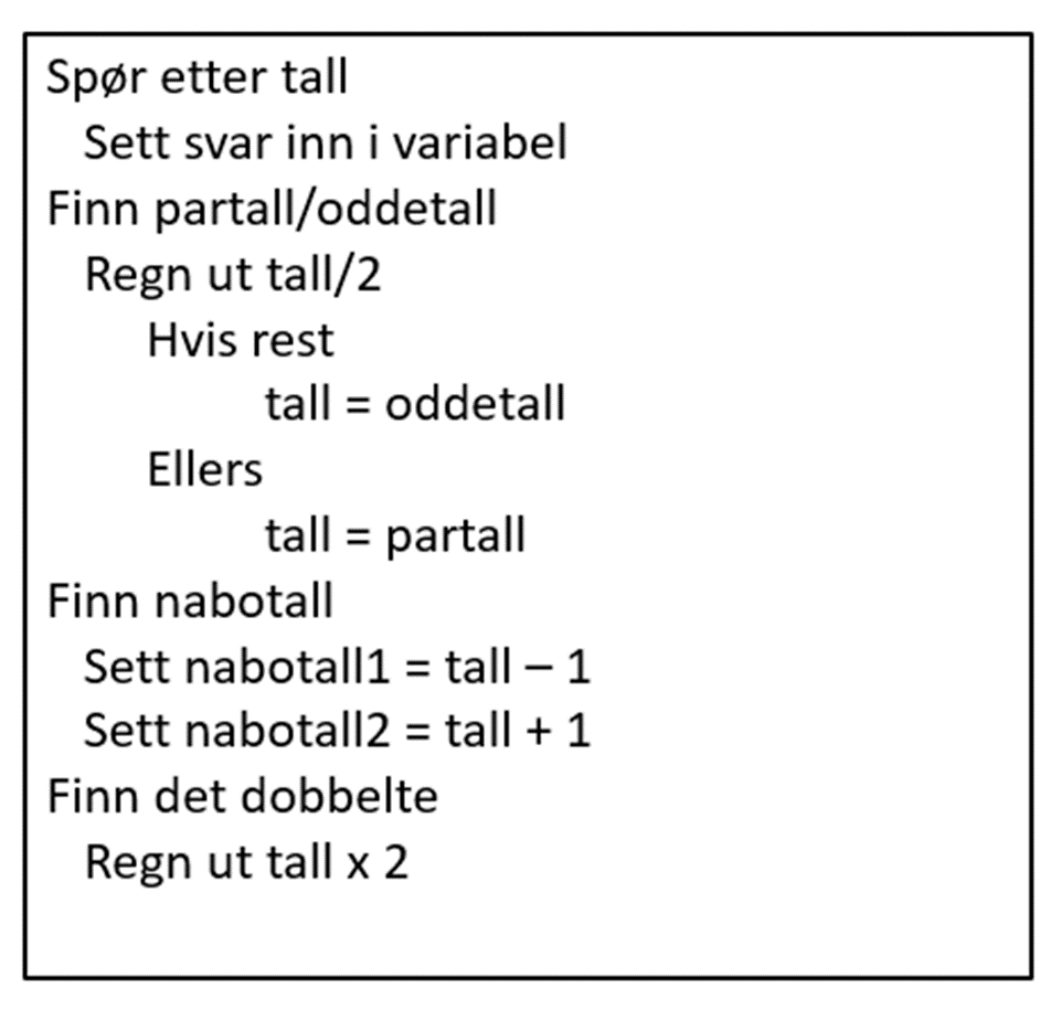 Pseudokoding er kode skrevet med et dagligdags språk som i all hovedsak forklarer hva som skal skje i programmet. Jeg bruker det ofte som et planleggingsverktøy sammen med elevene, slik at de vet hva som skal skje i programmet vi skal lage. På denne måten kan vi skape struktur og oversikt før vi begynner å programmere. Vi kan finne ut hvilke variabler vi trenger, hvor vi må legge inn en løkke og eventuelle vilkår. Kanskje ser vi allerede her hvilke blokker som trengs.