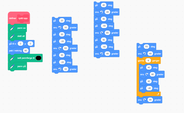 På https://oppgaver.kidsakoder.no finner du mange slike steg-for-steg oppgaver. Disse gir god lesetrening og de fleste elevene kommer som sagt i mål. Noen av oppgavene mangler noe informasjon som gjør at elevene må tenke selv for å komme i mål, i tillegg til at mange av oppgavene også inneholder muligheter for videreutvikling av programmene for de som synes det blir for lett.