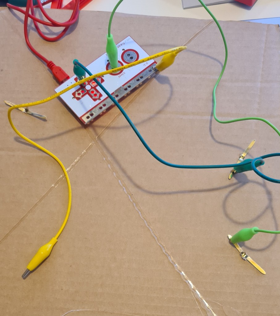 Monter krokodilleklemmer mellom splittbinders og MakeyMakey. Noter ned hvilken splitt som kobles hvor, gjerne ved siden av splittbindersen på baksiden. Koble deretter MakeyMakey til PC/Chromebook og koble til en krokodilleklemme til jord, for å sjekke at de ulike punktene er koblet rett. Om det er koblet rett, og kretsen er sluttet, går det strøm gjennom systemet. Da vil det komme fram et lys ved tilkoblingspunktet på MakeyMakey.