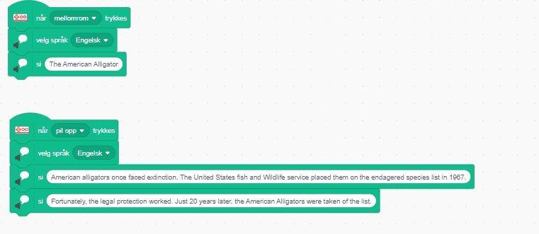 I dette eksempelet har jeg laget en informasjonsplakat på engelsk om den amerikanske alligatoren. Når de ulike splittbindersene trykkes, og jordingen er aktivert vil den gjennomføre koden som ligger under de ulike valgene.
