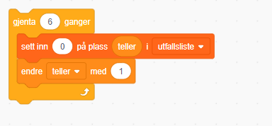 Under nullstilling av programmet, oppretter vi en ny variabelen, kalt teller. Denne skal holde styr på de ulike mulige utfallene, og er veldig viktig når vi oppretter listen vi skal lagre resultatene i.