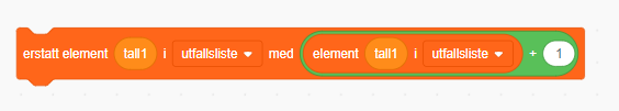 Vi går inn på koden hvor vi kaster terningen. Når terningen er kastet, skal vi endre antallet utkast. Dette kan gjøres på flere måter, men den enkleste er å erstatte elementet i listen for utfallet, med elementet som ligger der og plusse på en.