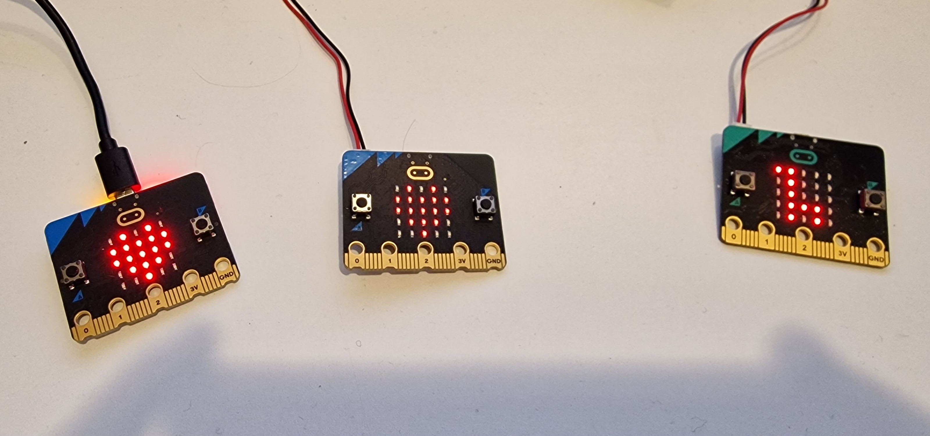 - Når vi trykker på A-knappen på microbit 1 – endres bildet på alle tre microbit