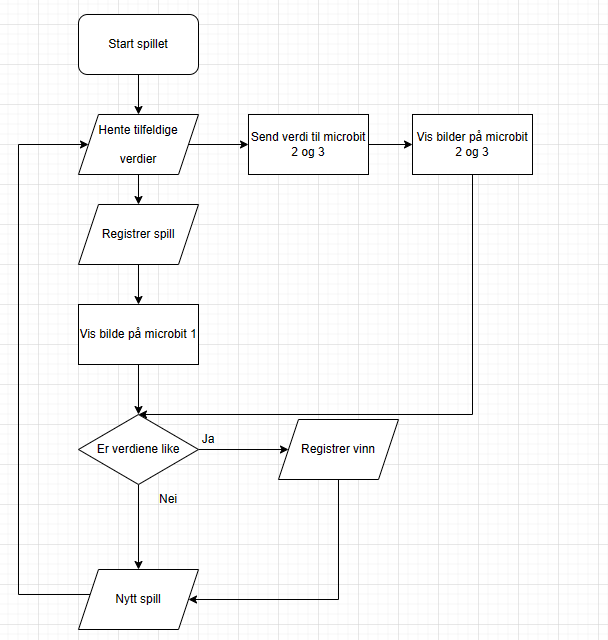 Vi skal lage et enkelt spill for microbit hvor vi spiller enarmet banditt. Vi skal bruke 3 micro:bits, så her blir det litt å holde kontroll på. Den ene microbiten skal styre det som skjer på de to andre. Når du trykker på A-knappen på microbit 1, skal den tilfeldig velge et tall mellom 1-3 og vise et bilde som er knyttet til tallet på hver av de tre microbitene. Om tallet er likt, skal vi telle opp antall ganger vi vinner. Trykker vi på B-knappen skal vi vise antall spill og frekvensen for å vinne