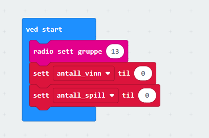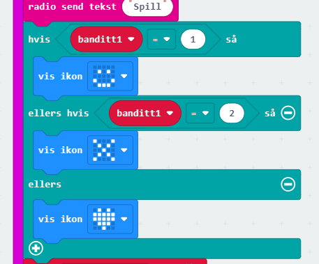 Da skal tre spill settes i gang. Den første microbiten skal hente ut et tall fra 1 til 3 og sende beskjed om at spillet er startet til de to andre microbitene. Samtidig er det viktig å nullstille variablene banditt2 og banditt3 på denne microbiten, slik at de ikke har verdier når et nytt spill begynner.