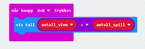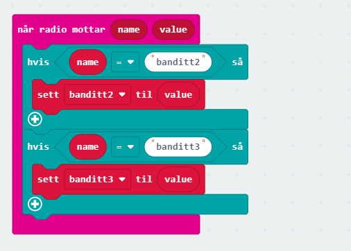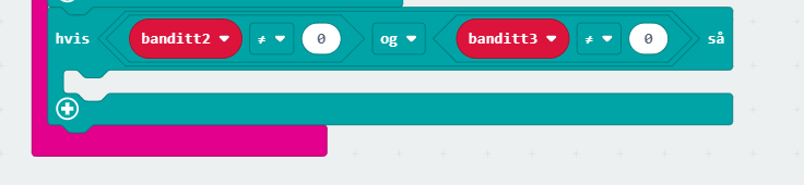 Før vi kontrollerer for om vi har vunnet i spillet, må vi kontrollere at begge de to andre microbitene har sendt inn verdier til den som styrer spillet. Dette gjør vi ved å teste på at variablene banditt2 og banditt3 IKKE er null.