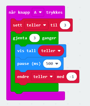 La oss lage en nedtelling. Når du trykker på A-knappen skal microbiten telle ned 3-2-1.