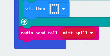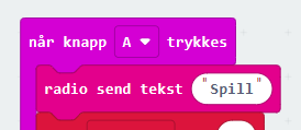 Master sender avgårde teksten «Spill» via radio til en annen microbit i samme gruppe.