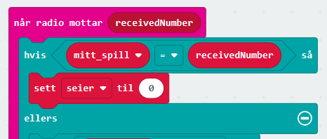 Den kaller funksjonen «spill» på akkurat samme måte som den gjorde før vi koblet microbitene sammen, men når den er ferdig å spille, sender den beskjed til «masteren» hva resultatet ble.
