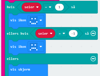 Vi fortsetter å bruke 1 for stein, 2 for saks og 3 for papir når vi skal kontrollere hvem som vinner. Den første testen, er å teste om de to microbitene har samme verdi. Da blir spillet uavgjort, og vi setter et flagg til 0. Jeg kaller dette flagget for seier.