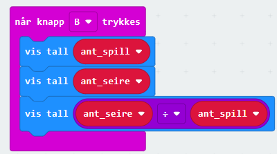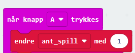 La oss utvide litt og legge til noen tellere for å hente ut litt statistikk. Vi skal telle opp antall spill vi gjennomfører, og hvor mange ganger de ulike vinner. Vi trenger en variabel som heter antall_spill, som nullstilles når microbiten starter, og som endres med 1 hver gang det foretas et spill. Denne trenger vi på begge microbitene.