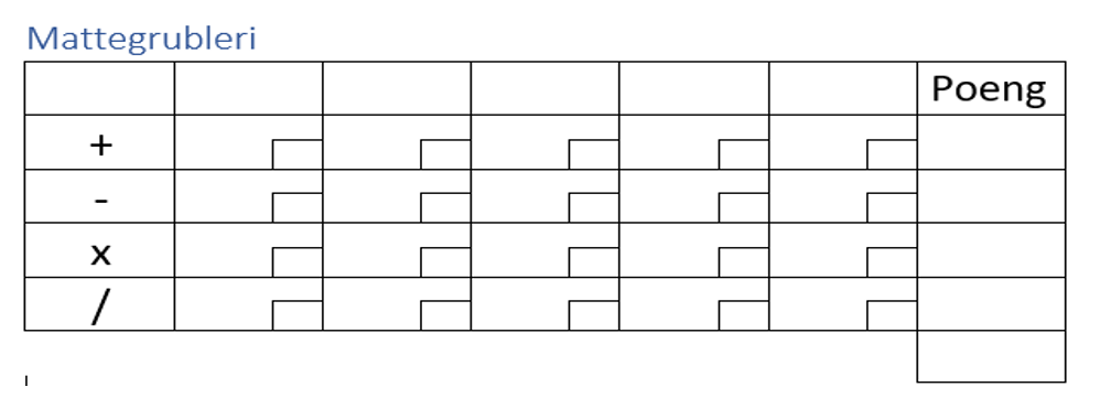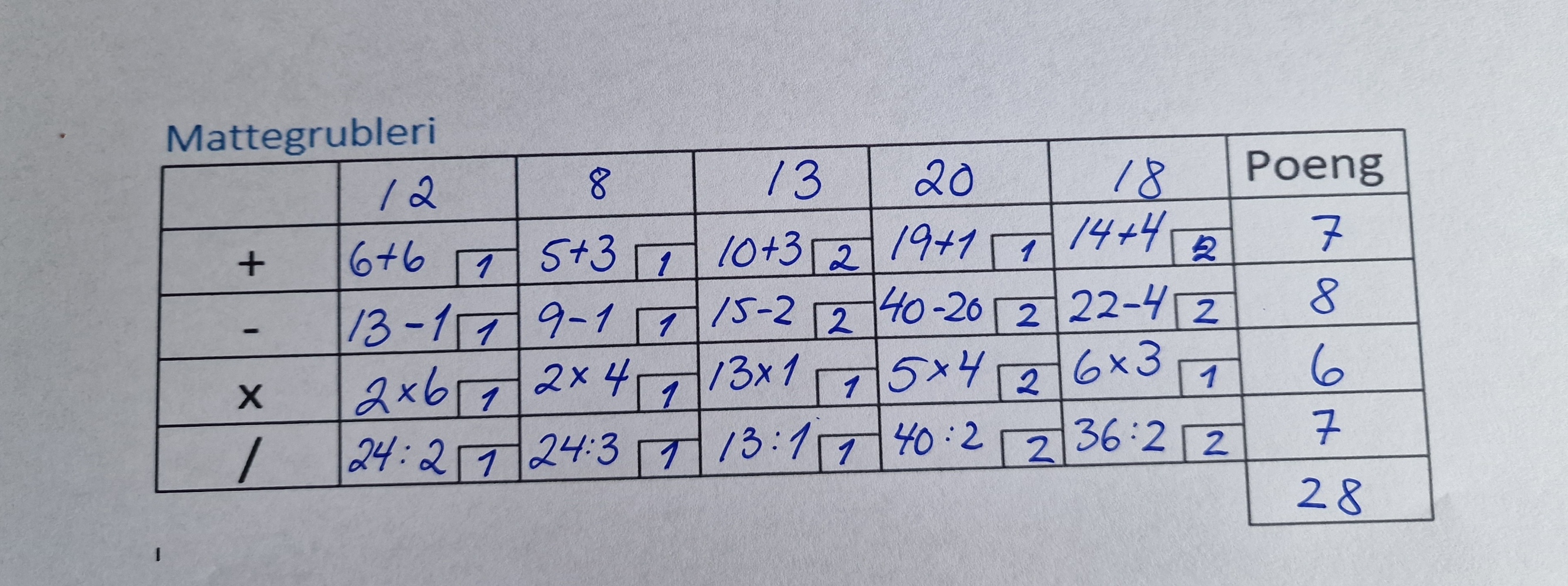 Elevene synes spillet Gruble er spennende og engasjerende. Derfor prøvde vi å lage en variant som er matematisk, og men som bygger på samme ide. Prøvde først ut en variant, som fungerte bra, men elevene kom med tilbakemelding om ting som måtte endres for at det skulle fungere.