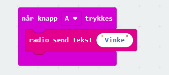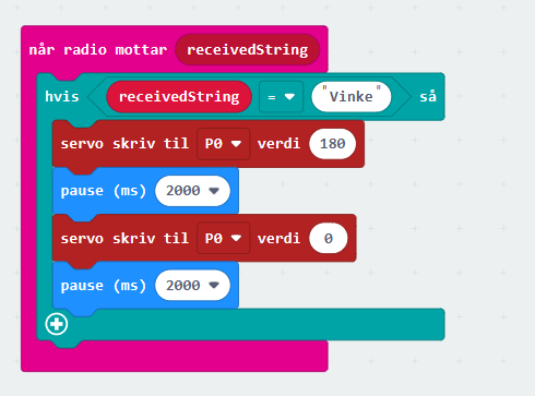 Dette fungerer selvfølgelig om vi skulle ønske å få en servomotor til å vinke. Vi sender teksten «Vinke» fra den ene microbiten.