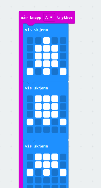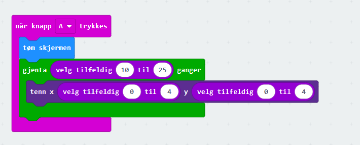 En enkel oppgave som tegner tilfeldige «bilder» på micro:bitens display. Tilfeldige punkter blir enten lyst opp eller forblir slukket. Tilfeldigheten gjelder både antall lys som tennes og hvor de tennes. Kanskje det blir noen fine, gjenkjennelige bilder…