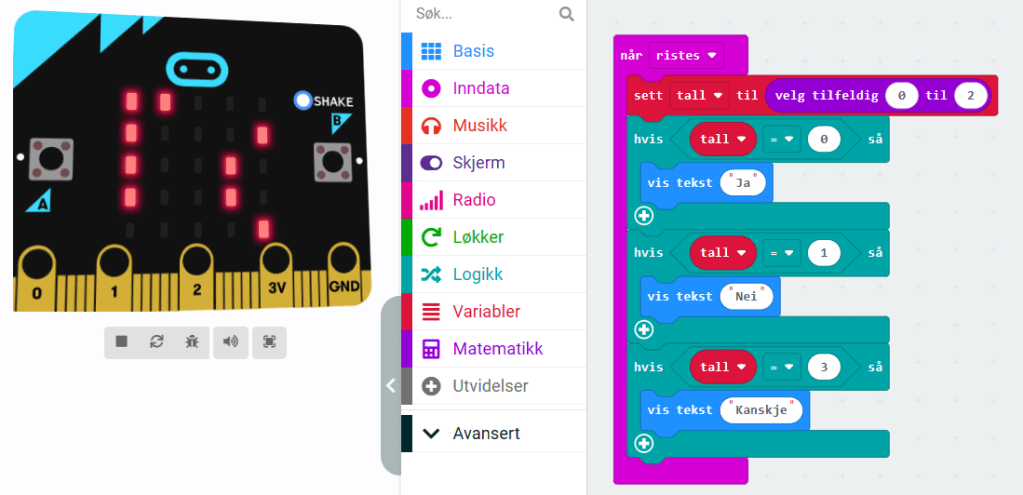 Dette var en av de første oppgavene jeg gjorde sammen med elevene mine. En eight-ball er en biljardball svarer på dine eksistensielle spørsmål med svarene «Ja», «Nei» eller «Kanskje» dersom en rister den. Elevene mine utviklet denne raskt til å ha både 5 og 6 svar på lur.