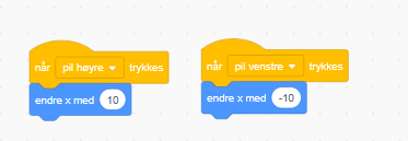 Vi må få kajakken til å bevege seg venstre og høyre. Dette gjør vi ved hjelp av piltastene. Høyre piltast mot høyre, altså endre x-verdien og venstre piltast mot venstre. Vi endrer x-verdien med 10 og -10. Dette er akkurat passelig fort.