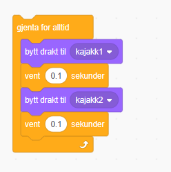 I en løkke, må jeg bytte mellom de to draktene, og jeg må legge inn en liten pause mellom slik at vi rekker å se byttet.