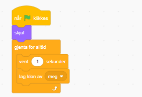 Når spillet starter, skal vi skjule steinen. Deretter skal vi lage en løkke som gjentas for alltid (eller så lenge spillet kjører). Vi skal vente et antall sekunder, før vi lager en kloning av steinen som skal komme mot kajakken.