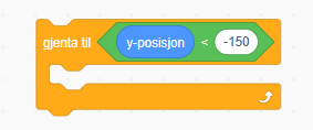 Vi trenger en løkke som gjennomfører en endring i y-aksen til den passerer et gitt sted. Når y-posisjonen er -150 er det greit å forsvinne.