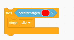 Hvis kajakken kolliderer med en stein, skal det spilles av en lyd, og hele spillet skal stoppe. Her kunne vi også kontrollert på om steinen treffer objektet kajakken, men siden det ikke er krise om en padleåre er borti en stein, så kontrollerer vi på fargen i kajakken.