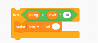 Dette kan vi gjøre enkelt på denne måten: Hvis har mer poeng enn level * 10, så endrer vi level med 1. Dermed endrer vi level på 11, 21, 31 osv.