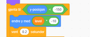 Under koden som styrer hvor fort steinene skal komme, endrer vi verdien som styrer endringen i y-verdi til å multipliseres med verdien i variabelen «level». Da vil den endres for hver gang «level» endres, altså etter 11, 21 osv poeng.