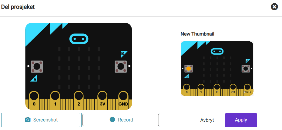 Det er også lagt inn mulighet for å endre miniatyrbilde for prosjektet ved å velge «Update project thumbnail». Her kan du ta skjermdump av microbiten når den kjøres, eller du kan ta en kort videosnutt.