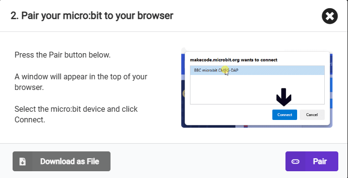 Trykk på «Last ned», koble til microbiten og deretter neste. Velg så «Pair» knappen og velg rett microbit.