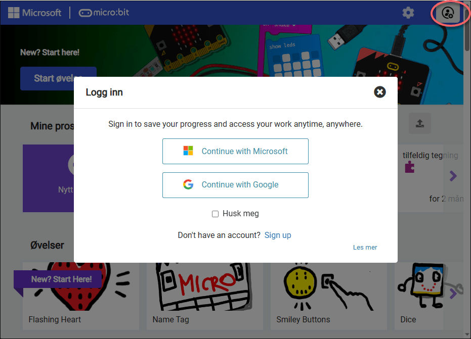 1. Mulighet for å logge på Makecode med Google eller Microsoft kontoer