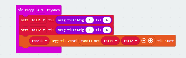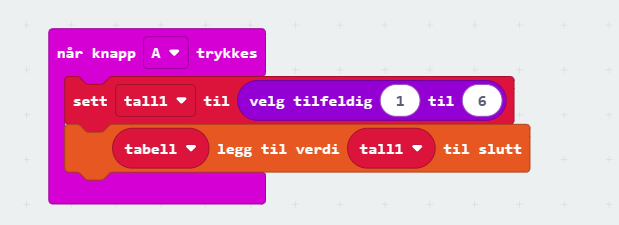 Når knapp A trykkes, skal vi trille en terning. Verdien, mellom 1 og 6, legger vi i en variabel vi kaller tall1 som vi legger inn i tabellen.