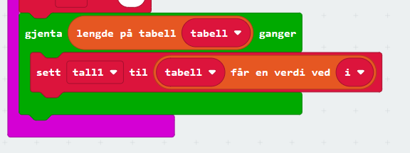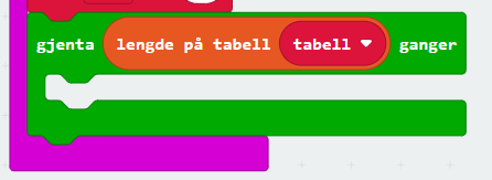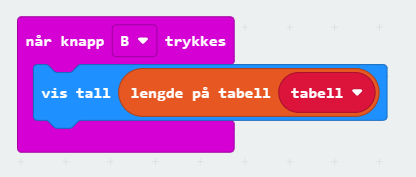 Tabeller i microbit blir lite brukt, men kan brukes på akkurat samme måte som i andre programmeringsspråk. Problemet med å bruke tabeller i microbit, er visning av innholdet i tabellen(e). Skjermen på en microbit er ikke laget for å vise de store datamengdene, så dermed må vi kanskje behandle dem litt før vi viser dem på skjermen. Alternativet er å bruke logg verktøyet til å «skrive» dataene.