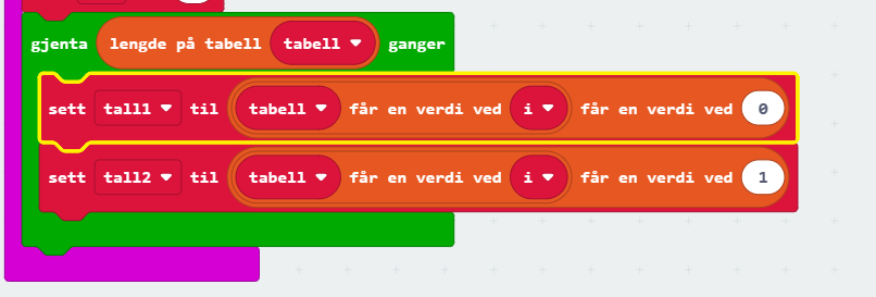 Vi skal nå begynne å hente ut data fra tabellen. Siden det er to forekomster per rad, må vi hente ut verdien fra plass 0 og plass 1. På plass 0 ligger tall1, og på plass 1 ligger tall2. Dermed må vi først hente ut raden «i» fra tabellen, og deretter kolonnene.