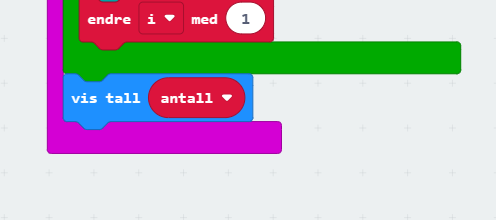 Da er det på tide å behandle dataene vi har hentet ut. Vi skal sjekke for om summen av de to tallene er større enn 7, så vi må lage en logisk test for å teste summen. Dersom summen er større enn 7, skal telleren «antall» økes med 1.