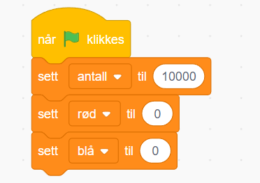 Vi trenger noen variabler i dette programmet. Vi trenger en som bestemmer hvor mange trekninger vi skal gjøre, en som teller opp antall røde baller og en som teller opp antall blå baller.