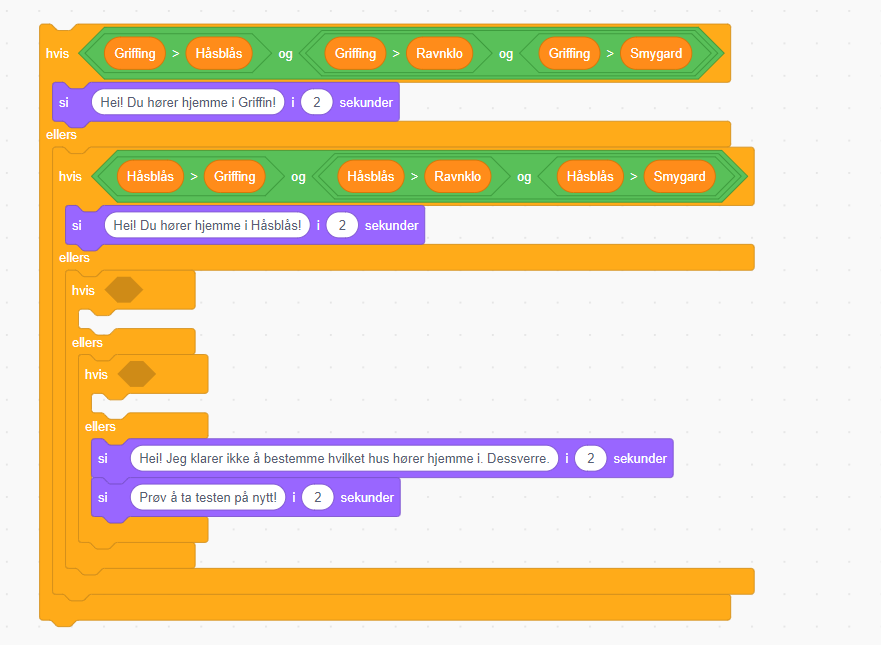 Når en er ferdig med spørsmålene, må en gå gjennom poengsummene de ulike husene har fått og finne ut hvilket hus en hører hjemme i. Dette gjør vi ved å sammenligne verdiene i de ulike «hus-variablene». Om «Griffin» verdien er høyere enn «Håsblås», «Ravnklo» og «Smygard» skal du i «Griffin» osv.