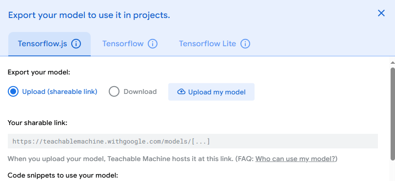 Når du er fornøyd med modellen er det på tide å eksportere den. Det kan gjøres på flere måter. Du kan laste den opp i skyen, og få en URL som du kan bruke i prosjektet ditt eller dele med andre. Eller du kan laste modellen ned, og gjenbruke den slik du ønsker i andre prosjekter.