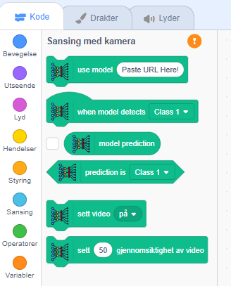 Ved å legge til Teachable Machine fra tilleggene får vi noen ekstra blokker som vi kan bruke for å utnytte informasjonen som kommer fra modellen vi laget i steg 1-4.