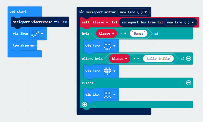 Ved oppstart kobler vi microbiten til serieporten. For å vise at det gikk bra, viser vi et «Check» symbol. Deretter legger vi inn kode, som kjøres hver gang det kommer en ny linje sendt til microbiten. Denne linjen skal inneholde informasjon som forteller hvilken klasse som blir gjenkjent i modellen.