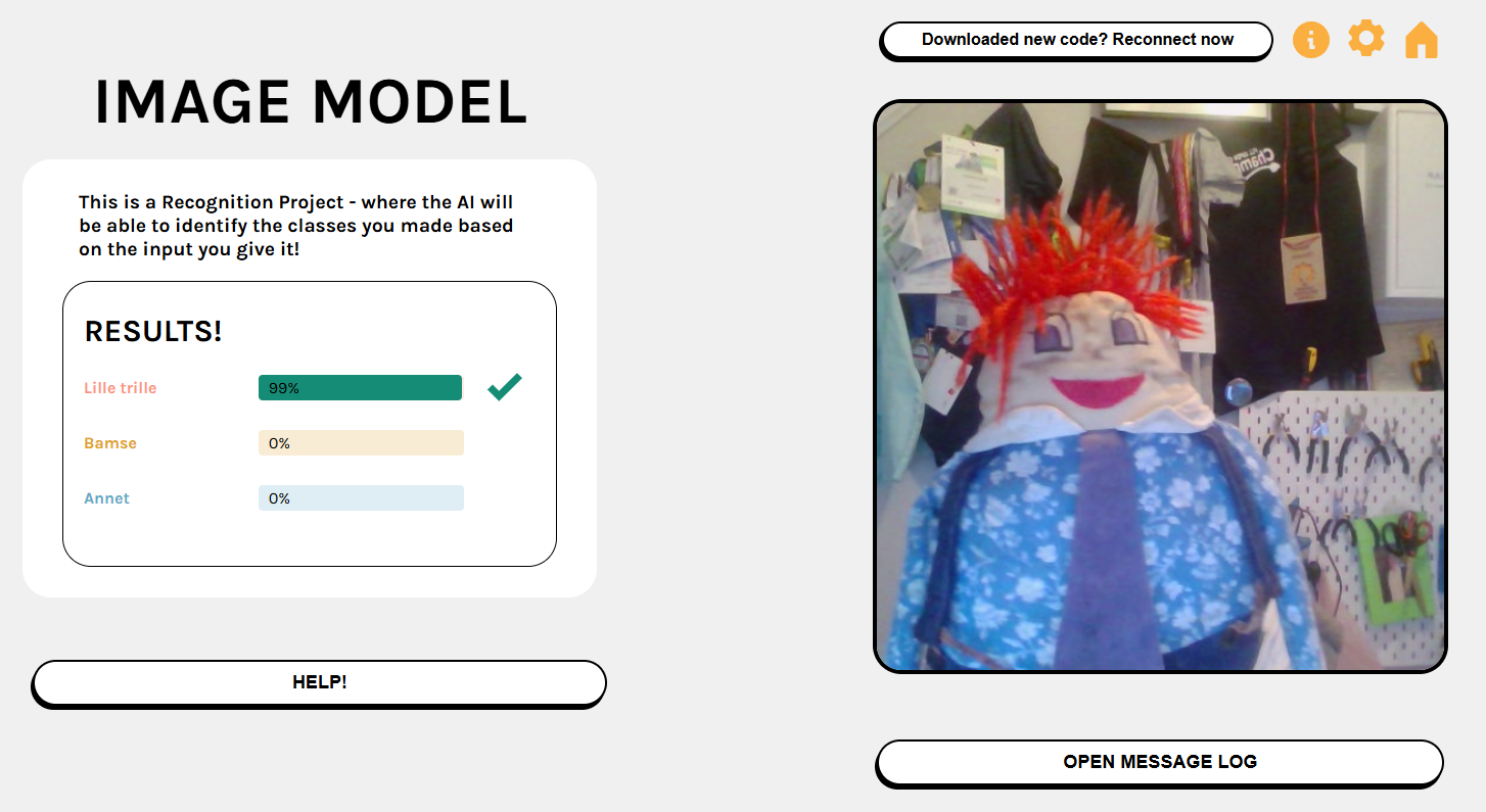Modellen lastes inn og du får tilgang til modellens resultater i samtid. Hver gang den ser noe nytt/hører noe nytt sender den en ny melding avgårde. Disse kan du se i meldingsloggen nede til høyre.