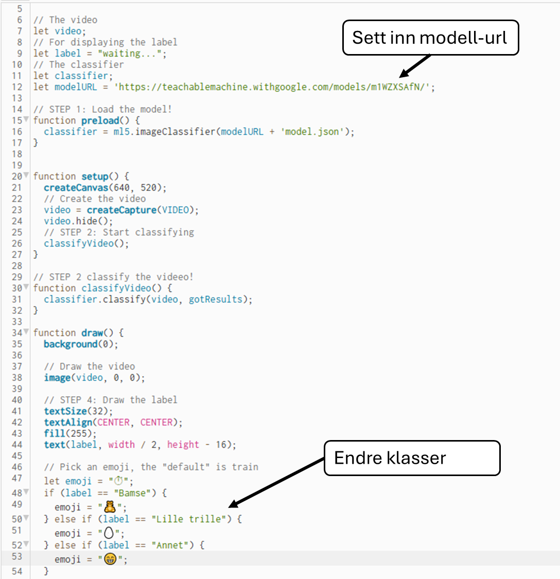 NB! Det ligger et eksempel direkte for nedlasting på eksportsiden til Teachable Machine, men jeg har ikke fått den til å fungere tilfredsstillende. Derimot finnes flere andre eksempler på bruk av Teachable Machine sammen med P5.js, blant annet denne fra codingtrain: https://editor.p5js.org/codingtrain/sketches/PoZXqbu4v