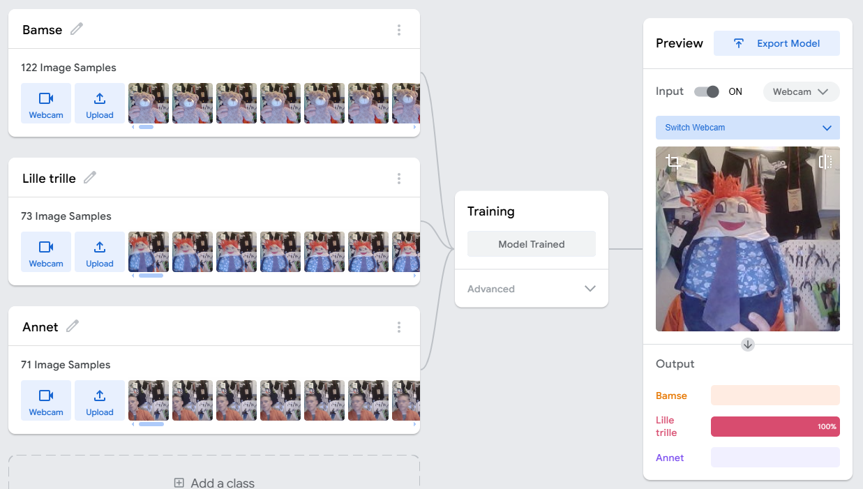 Du ser kvaliteten på modellen under Output. Om den ikke fungerer, må du trene den mer ved å legge inn flere bilder eller mer lyd den kan trenes med.