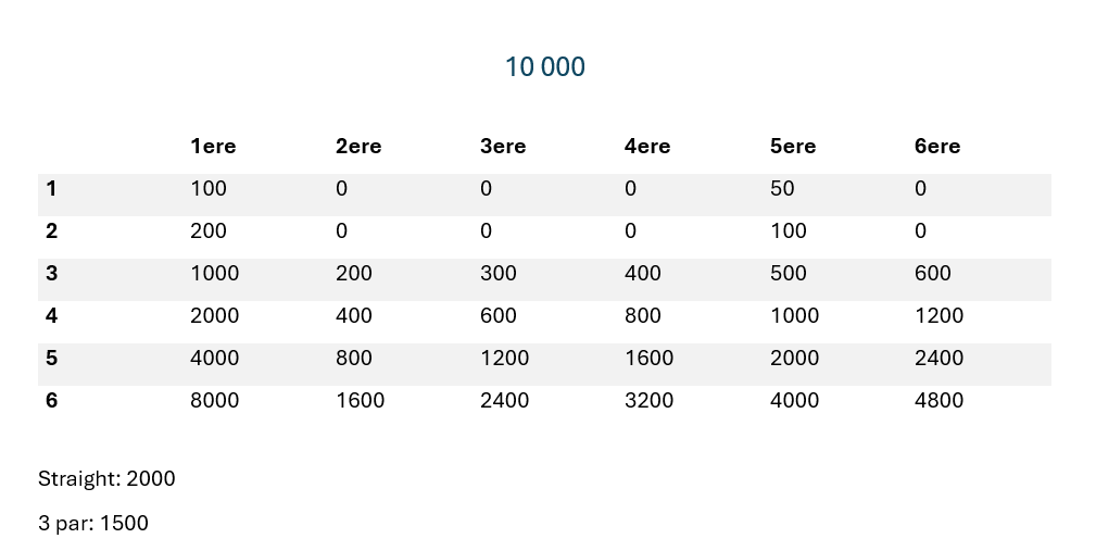 Spennende og intenst spill som kan spilles på flere måter. Elevene spiller mot hverandre, og det brukes 6 terninger. Eleven triller og får poeng ut fra tabellen under. En kan hente flere poeng på en omgang. Poengene legges til eventuell tidligere poengsum, og den som kommer først til 10 000 er den som vinner.